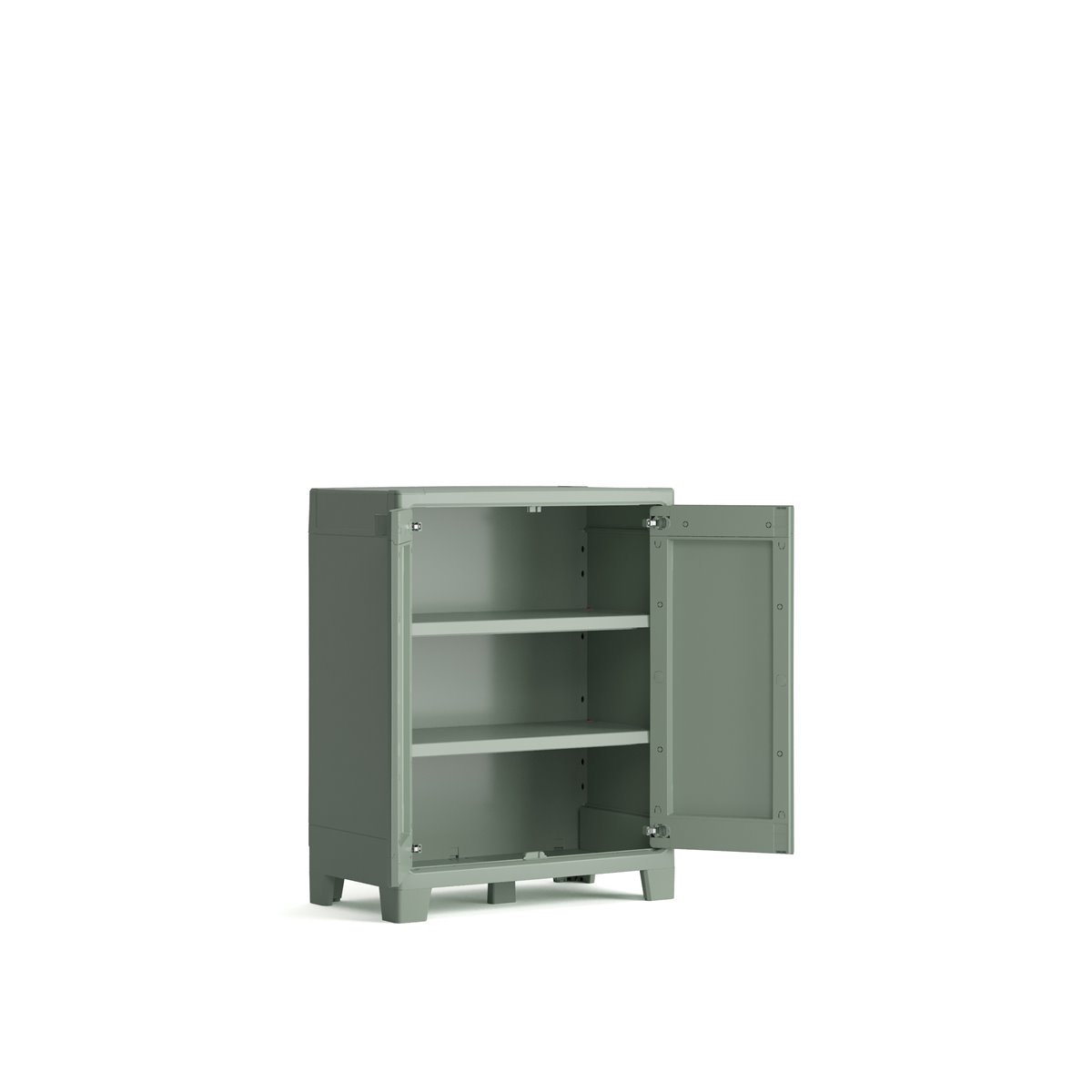O armário resina de exterior PLANET baixo, num tom verde vibrante, é ideal para colocar no exterior graças ao seu design resistente e funcional. Com medidas de 100x80x44 cm, oferece uma arrumação prática sem ocupar demasiado espaço. Perfeito para guardar ferramentas, acessórios de jardinagem ou equipamento desportivo, mantendo tudo protegido e bem organizado. A construção robusta garante durabilidade contra as intempéries, enquanto a cor verde combina na perfeição com o ambiente exterior. É uma solução estética e eficiente para qualquer recanto ao ar-livre.