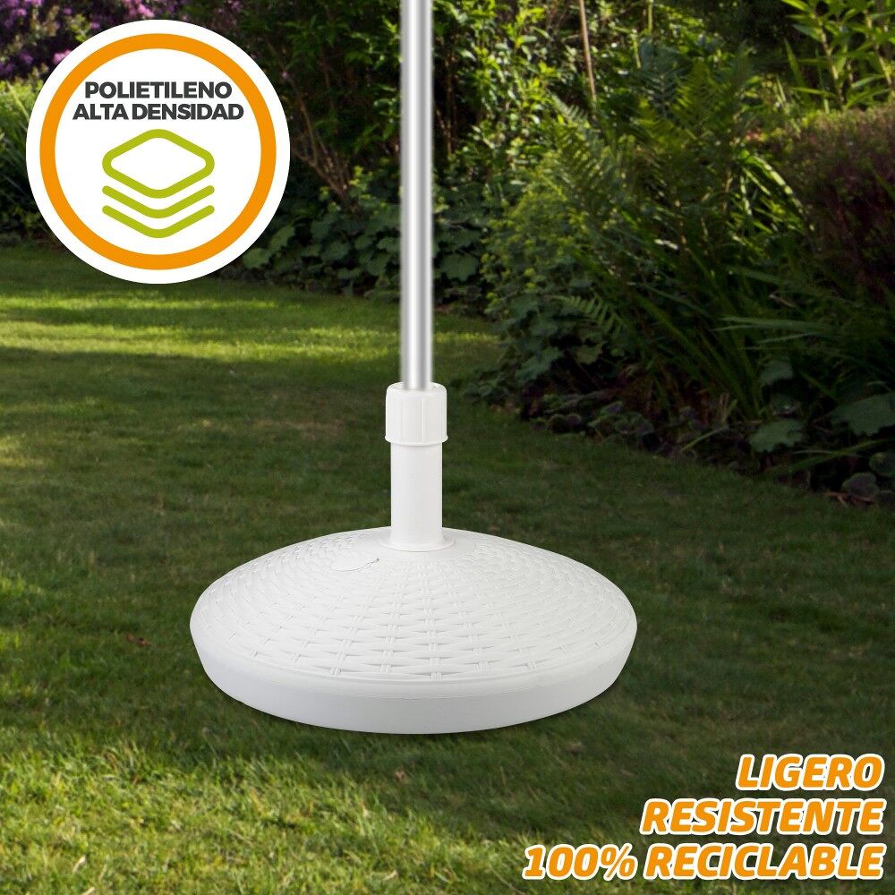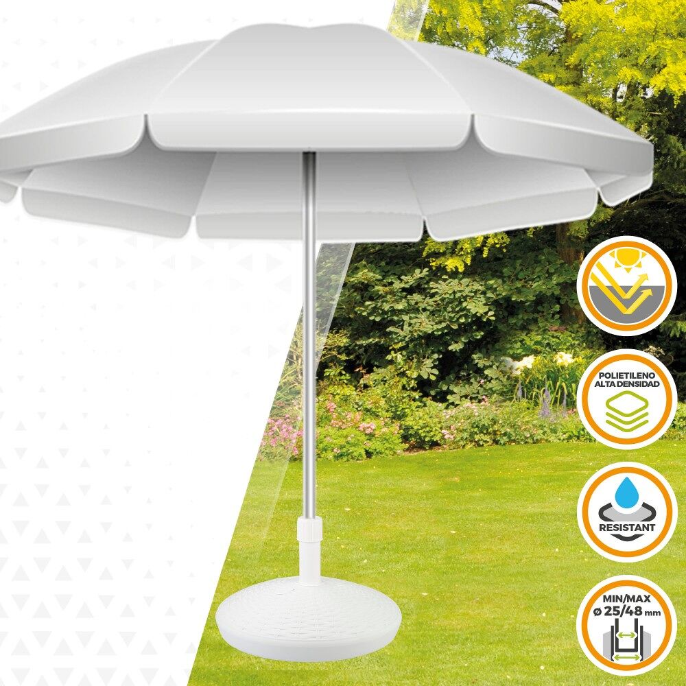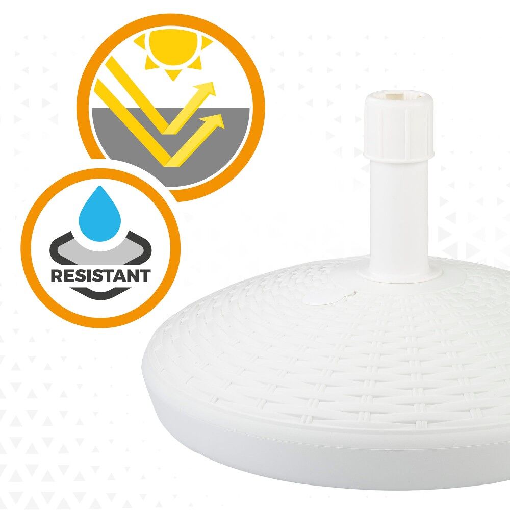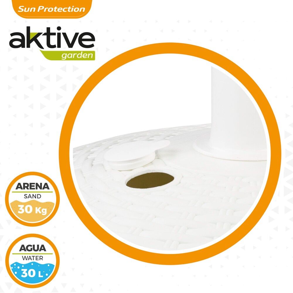 Suporte de guarda-sol Aktive Garden em formato circular. Tem um design branco simples e elegante decorado com relevo. Mede Ø58 x 35 cm e é perfeito para guarda-chuvas com varas de 25 a 48 milímetros de diâmetro, pois o tubo possui rosca ajustável. É feito de poliresina, um material leve, resistente à água e à luz solar. Possui um tanque com tampa que pode ser enchido com água (30 l) ou areia (30 kg). Ideal para garantir a estabilidade e sustentação do seu guarda-chuva contra o vento.
