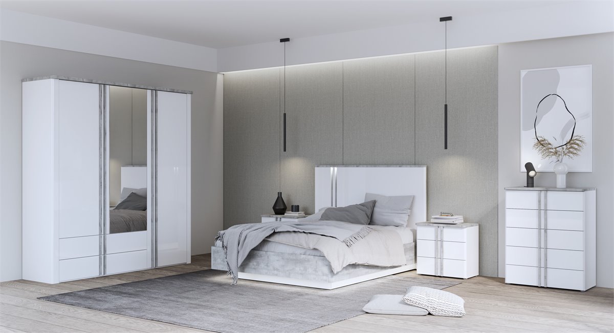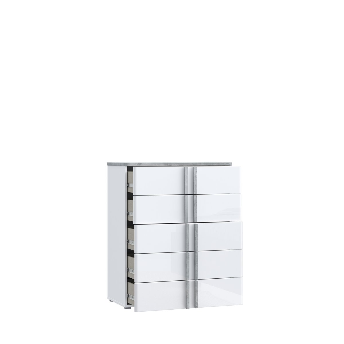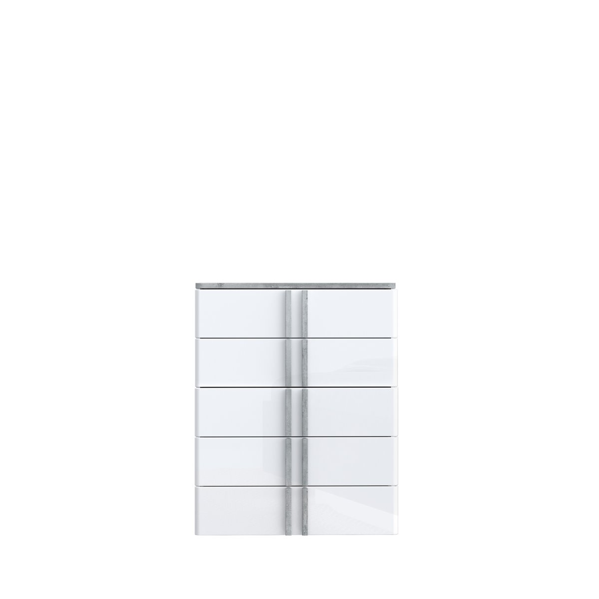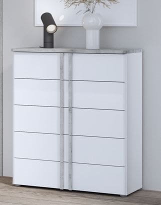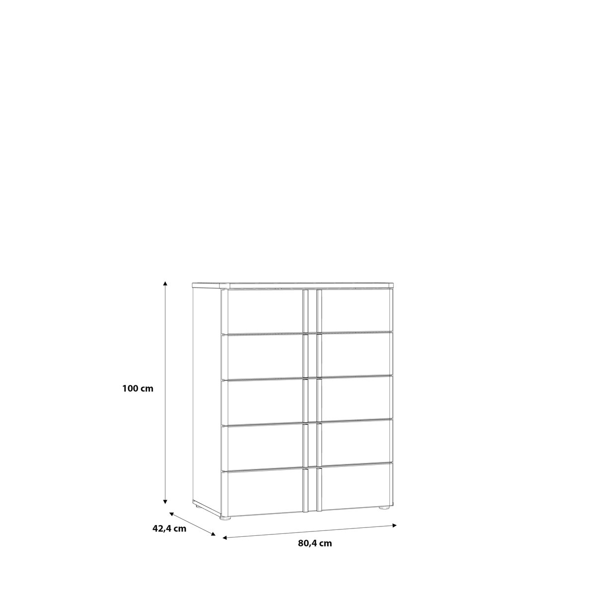 Transforme o seu quarto com a cómoda BUGANVILLA! Esta elegante cómoda com 5 gavetas não só vai adicionar estilo ao seu quarto, como também vai manter os seus pertences organizados e seguros. Os puxadores DM e as frentes em alto brilho dão um toque de sofisticação e elegância à cómoda, enquanto os tampos e frentes curvas evitam batidas acidentais. Não perca a oportunidade de fazer um refresh ao seu quarto com a elegante cómoda BUGANVILLA!
