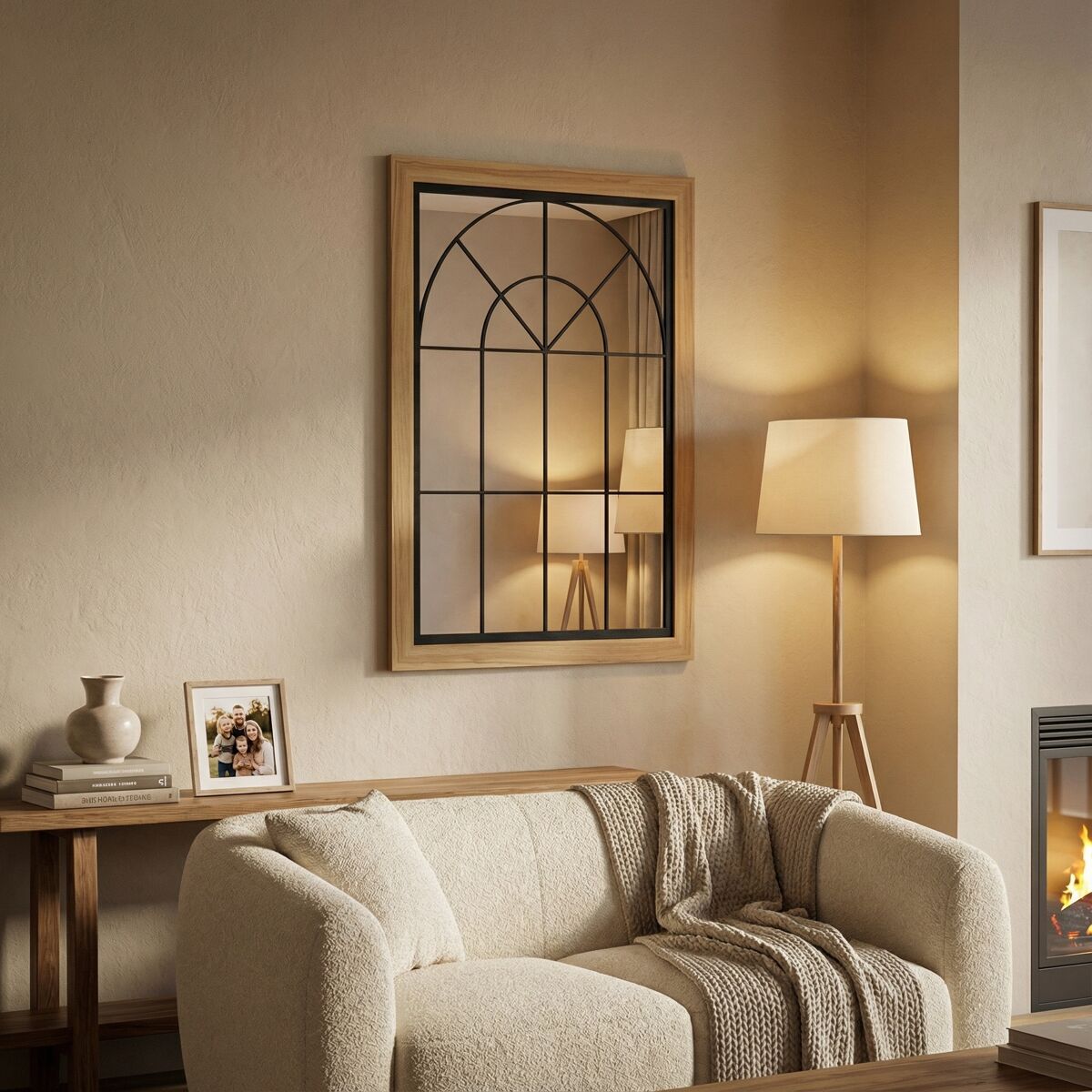 Espelho De Parede Em Forma De Arco Com Efeito Janela, Que Combina Moldura De Madeira E Detalhes Em Metal Preto. Uso Interno