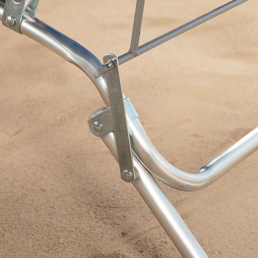 - Materiais: estrutura de alumínio (forte e durável), tecido textilene reforçado 2x1 (forte, respirável e fácil de limpar) e apoios de braços de plástico