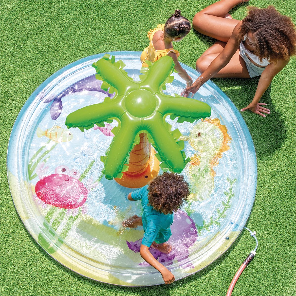 - Rápido e fácil de montar: basta inflar, encher com água e conectar a mangueira para ativar o efeito spray