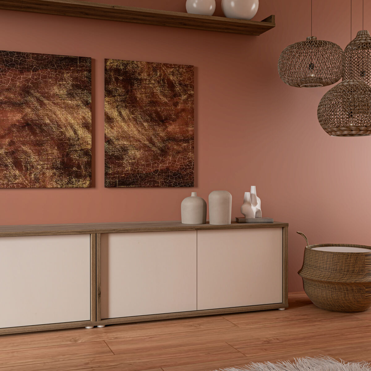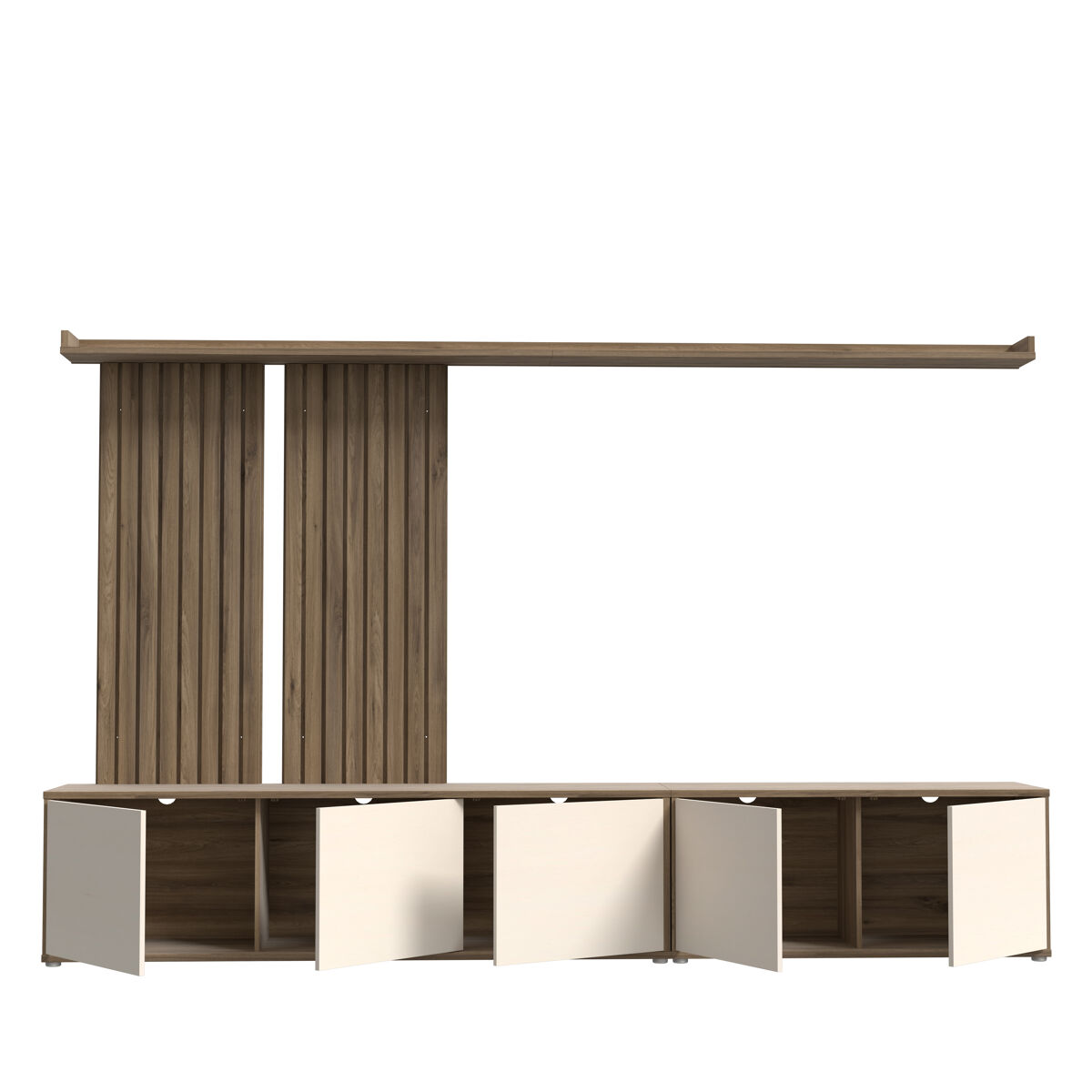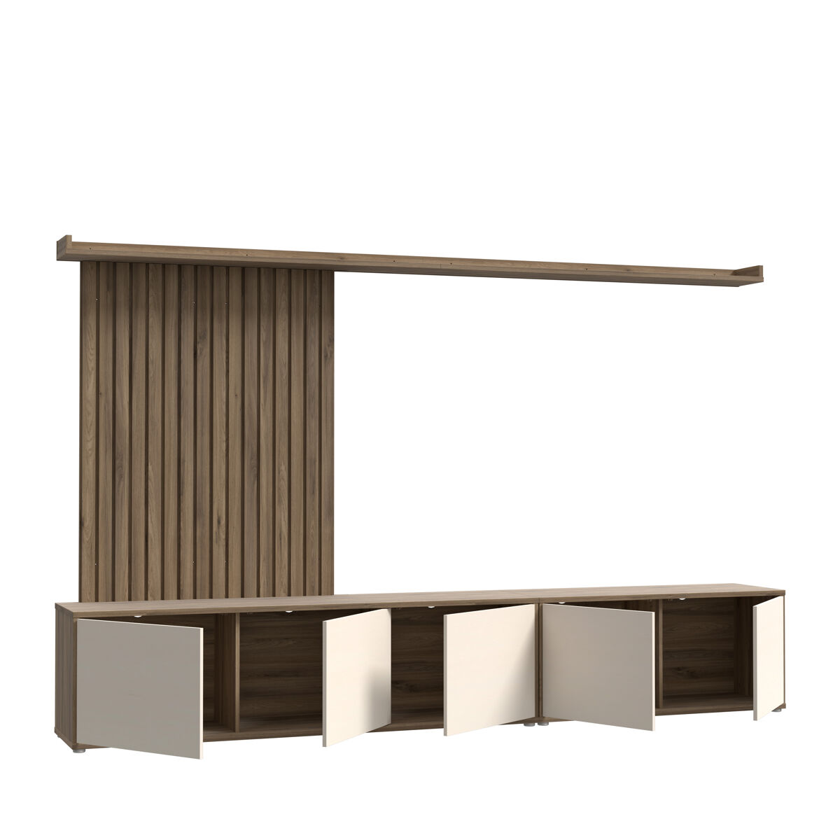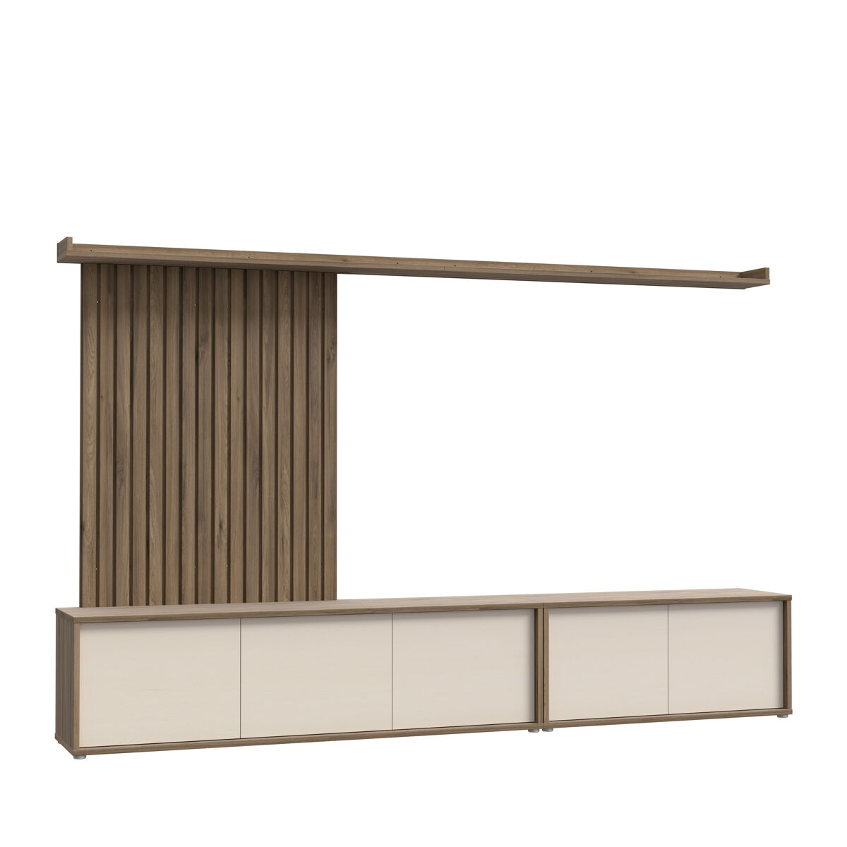 Descubra a solução perfeita para maximizar o seu espaço com a versão alongada do móvel de tv SKELPE. Este móvel versátil de cinco portas possibilita ter um móvel de tv maior do que o habitual. Possui dois painéis originais e duas prateleiras. Fabricado em aglomerado de partículas laminadas de alta qualidade, combina na perfeição os tons quentes do carvalho com o bege suave, criando uma harmonia visual que se adapta a qualquer decoração.